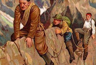 Grupo de escaladores cresteando. Editorial Liebig, 1920.