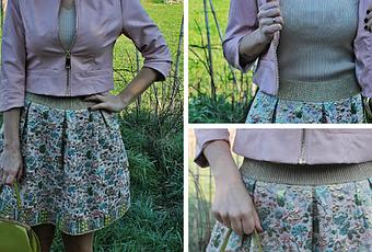 El primer look es una falda estampada y con abalorios en tonos pasteles que he combinado con top de canalé y chaqueta efecto cuero en tono rosa palo. Unos peep toes en nude y bolsito de mano en verde para darle el toque chic y de color.Es un look perfecto para un bautizo o una comunión por sus colores claros y por su estilo arreglado pero no recargado.