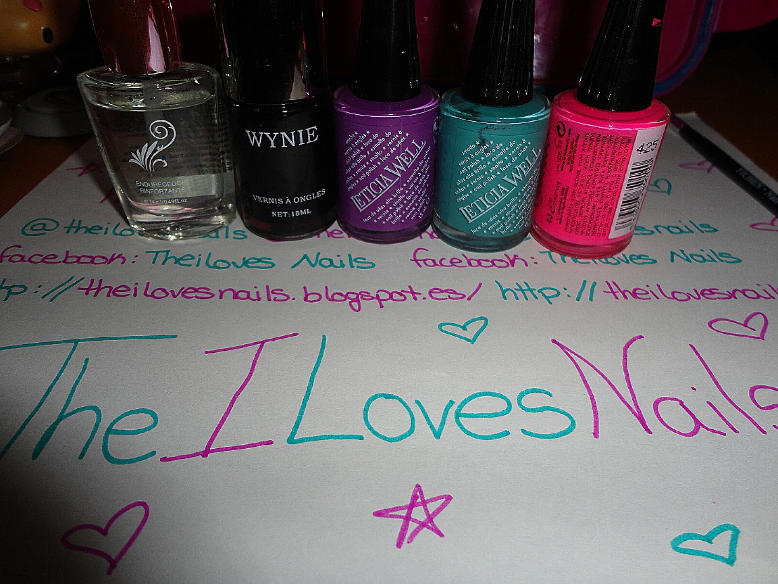 - Top coat: Vernis a ongles --> Nº 532- Negro: Wynie --> Nº 284- Morado: Leticia Well --> Nº 445- Celeste o verde agua: Leticia Well --> Nº 457 - Rosa: Leticia Well --> Nº 425