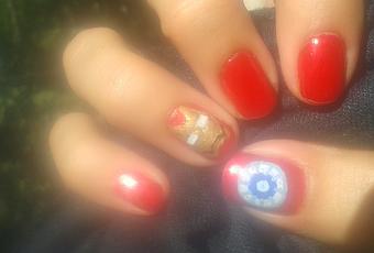 Con todas las uñas esmaltadas de un esmalte rojo con un fino shimmer dorado; esmalte ideal para hacer un nail art de Iron Man, he dibujado en el dedo anular el casco de Iron Man mientras que en el dedo pulgar realice el reactor arc que lleva montado a su pecho, las demás uñas solo lucen de color rojo ya que este color es el protagonista.