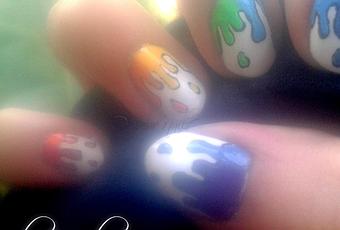 Desde hace mucho tiempo tenía ganas de hacer una manicura así, una manicura en donde a las uñas les escurre pintura de color, en este caso los colores del arco iris. Me encantan mucho los colores y para que resaltaran muy bien les puse un fondo blanco y con ayuda de pinturas acrílicas realice el diseño de pintura colocando dos colores en cada uña.