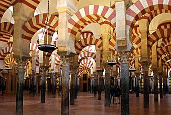 1.- El legado artístico del mundo musulmán: El arte de Al-Andalus pasa por tres grandes etapas: a) La etapa califal donde destacan la mezquita de Córdoba y el palacio de Medina-Azahara. b) La etapa taifa y almohade, representada por la Giralda y la Torre del Oro de Sevilla y el palacio de la Aljafería de Zaragoza. c) Etapa granadina o nazarí, en la que destaca el palacio de la Alhambra y los jardines del Generalife. La influencia del arte musulmán pervivió a través del arte mozárabe que influyó en los orígenes del arte románico y en el arte mudejar, influido por el trabajo de albañiles musulmanes que trabajaron hasta el siglo XVI. 1.2.- La Arquitectura: Sintetizó elementos anteriores paleocristianos, bizantinos, y en España, romanos y visigóticos. Al combinar la herencia oriental y occidental, hasta alcanzar un esplendor admirable. En sustitución de los sillares de piedra se optó por materiales más pobres y blandos, como el ladrillo, la madera y el estuco, más dúctiles para la decoración minuciosa. Prestaron más atención a lo ornamental que a lo estructural. Por ejemplo, los nervios de las bóvedas no se cruzaban en el centro. Se empleó el arco de herradura enmarcado en un alfiz, los arcos lobulados y la pintura de las dovelas con colores alternados. Mezquitas y palacios: A mediados del siglo VIII el emir Abderraman I ordenó el inicio de la construcción de la mezquita de Córdoba que fue continuada por sus descendientes y rematada por Almanzor en tiempos del califato. Su rasgo más original es la superposición de columna y pilar para resolver el problema de la altura, convirtiendo la sala de columnas en un extraordinario bosque de piedra y mármoles. Las dovelas están coloreadas en blanco y rojo. En las puertas y zonas nobles como el mirhab, construido en tiempos de Al-Hakam II , mármoles, dovelas pintadas y letras como ornamentación caligráfica. Muy importante fue, asimismo, la impresionante ciudad-palacio de Madinat al-Zahra, edificada en tiempos de Abd-al-Rahman III. Para su construcción se trajeron materiales de diversos lugares, como el norte de África, de donde procedía el mármol. Madinat al-Zahra albergaba, en su parte superior, una serie de palacios; en la zona media, jardines y vergeles, y en la parte inferior, la mezquita mayor y las viviendas de los servidores de palacio. Desafortunadamente, durante la guerra civil que precedió a la desaparición del califato, Madinat al-Zahra fue destruida. La Alhambra de Granada junto al paisaje de Sierra Nevada es un palacio-fortaleza construido entre los siglos XIV y XV. Se compone de un conjunto de torres, murallas, jardines y patios en su zona militar y de habitaciones interminables para el servicio en su zona palatina que culmina en la residencia del rey. Destaca el salón del trono o la sala de Abencerrajes con patios como el de los Leones o el de Comares, donde las fuentes son elemento destacado. La ornamentación cuenta con cuenta con arcos peraltados con gallones, mocárabes, dorados de las maderas, mosaicos geométricos y caligráficos.