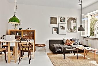 Espacioso y decorado con mucho estilo, así es este apartamento de tan sólo 35 m² en el que hay cabida para todo lo necesario. Sobre un fondo blanco salpicado con muy poco color, excepto algún detalle en gris y verde, el color protagonista es el madera. El dueño del pequeño piso ha sabido con acierto elegir piezas de mobiliario ligeras y funcionales, aprovechar bien la luz natural y en su defecto apoyar la iluminación con lámparas pendulares. Llaman la atención las sillas Thonet alrededor de la mesa de comedor, que junto al logo NYC en la manta y la lámina del plano de Manhattan le dan al salón cierto aire de bistro/café.