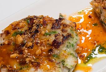 Para el acabado y la presentación: ·Hacer pequeñas mini hamburguesas con la sepia macerada con la leche y el pan rallado. · Saltear con un poco de aceite, mojar con la picada y servir.