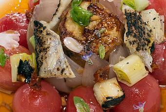 ELABORACIÓN · Escaldar y pelar los tomates. · Asar el pimiento, la berenjena y la cebolla en el horno durante 20 minutos 180ºC · Colocar en el centro del plato la brandada de bacalao y cubrir con la verdura asada. · Colocar los tomates pelados alrededor de la brandada y las verduras asadas. · Asar el capellán, trocearlo y colocar alrededor. · Rociar con abundante aceite de oliva virgen extra · Aromatizar con hojas de albahaca fresca y mojar con el caldo del asado de verduras.