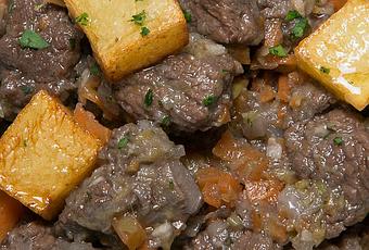 Elaboraciones: Para la salsa Picar el ajo y la cebolla En una cazuela dorar el ajo con aceite. Añadir la cebolla y sofreírla. Añadir la almendra molida y rehogarla. Añadir el pimentón, enseguida regar con el vino blanco y hervir hasta que evapore el alcohol. Añadir el pan frito, el caldo y hervir durante 3 minutos. Agregar un toque de molinillo de comino, clavo, nuez moscada, canela, pimienta de Jamaica y sal. Triturar todo hasta que quede una crema fina. Para la carne Cortar la ternera en dados de bocado y salpimentarla. Calentar el aceite en una sartén y saltear la ternera.