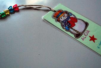 En mi casa siempre hemos sido muy lectores y el marcapáginas era la etiqueta por excelencia. Se recorta un trozo de cartulina y se personaliza, poniendo el nombre, pegatinas, dibujos… ¡lo que te apetezca! En este caso la que os enseño la preparamos hace muuuuuchísimo tiempo pero al plastificarla está intacta. Además, le añadimos un colgante para que se viera por fuera del libro.