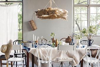 Distribuye unos sombreros de paja en el respaldo de la silla, unas jarras forradas de mimbre, forra la lámpara con ratán, damajuanas, vasijas de vidrio vintage, apeos de labranza .............¡Todo lo necesario para crear una atmósfera campestre que tanto no evoca al verano!