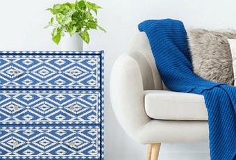 En la imagen de cabecera ya habéis podido ver esta preciosa cómoda de estilo étnico. Parece mentira que se trate de una sencilla pieza de pino de IKEA. La transformación es posible gracias al trabajo de pintura que han realizado en el blog Ikea hackers. Primero tendremos que pintar el exterior de nuestra cómoda con una pintura azul y luego crear un dibujo con la técnica de stencil o estarcido.