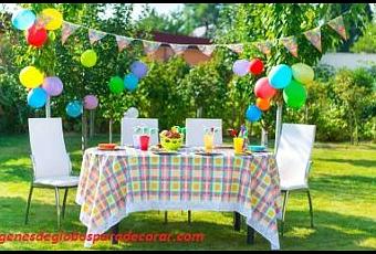Vemos esta primera opción de decoración la cual podemos hacer en el campo, tan solo necesitas una mesa, sillas, mantel colorido, comida y globos para decorar la fiesta, podemos agregar dulces, así como también frutas, esta es una decoracion de fiesta infantil en casa.