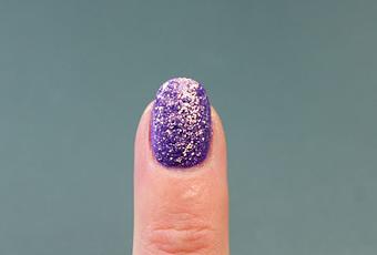 Para el primer diseño vamos a utilizar un tipo de purpurina llamada flackies, que son como escamitas muy ligeras, pero vosotras podéis utilizar cualquier tipo de purpurina fina. Ya hemos pintado la base así que hemos dado otra capa encima y sin dejar secar metemos la uña en el frasco de la purpurina sin necesidad de apretar, puesto que con un solo toque la purpurina va a quedar adherida. Estos copos de purpurina que veis son muy finos y tienen dos tonalidades: violeta y dorado. El sobrante lo podéis limpiar una vez que seque con el pincel de abanico.