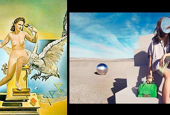 La foto que muestro se basa en el cuadro Leda Atomica de Dalí, pero el resto la campaña de DVF se sirve del lenguaje gráfico de Dalí: inmensidad del espacio con cielo y horizonte lejanos. El rostro sin cara recuerda a Magritte y su cuadro The pilgrim (1966)