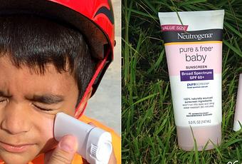 1. Bloqueador solar - Asegúrate de conseguir un bloqueador que sea más de 60% de Factor de Protección Solar (SPF por sus siglas en inglés), resistente al agua, que sea adecuado para la piel de bebés y niños y que no se corra a los ojos al sudar o hacer contacto con el agua. Yo uso este para mi nene: