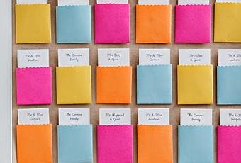 1. El primero lo he encontrado aquí, y viene con tutorial incluido, se trata de hacer un montaje con tarjetas metidas dentro de sobres de colores, dejando visible sólo la parte del nombre del invitado.