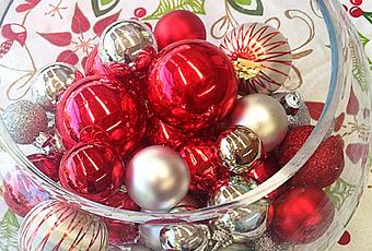 Comience con un mantel que le encante, como el mantel Christmas Time Tinsel Dove que se muestra aquí. Cree un centro de mesa navideño simple (o dos o incluso tres, según el tamaño de su mesa). Empecé con un jarrón grande en forma de cuenco Etc Verdi y una variedad de bolas rojas y plateadas pequeñas y medianas que no estábamos usando en nuestro árbol de Navidad de color caramelo.