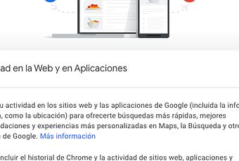 Los controles de la actividad de la cuenta te permiten, en un solo lugar, elegir los ajustes que quieres que guarden datos de tu cuenta de Google e incluye: