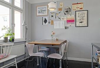 Acostumbrados a que os enseñe hogares donde el ‘desorden’ suele estar escondido, en este pequeño piso la estrategia de decoración es todo lo contrario, estantes en todas las habitaciones donde se muestran libros, adornos y multitud de láminas y fotografías en las paredes. Son detalles que hacen que los hogares nos parezcan más reales, más vividos, donde vive gente de verdad que come, trabaja, se divierte y descansa y que no solo posa en una esquina un momento para una foto como muchas casas de revista. Llaman la atención la puerta azul del salón y otras piezas recicladas como el armario y los caballetes de la oficina, el suelo negro de la cocina, la colección de botes de té… muchos rincones donde mirar :))
