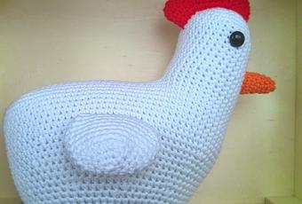 Esta gallina no ha tenido demasiado éxito en casa, tal vez tenga una forma demasiado sencilla o poco color, o no tenga patas. La he pensado para un usuario de menos de dos años, de esos que puedes llevar a cualquier sitio e incluso usarla de pequeña almohada.