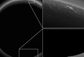El recuadro en la parte superior derecha muestra detalles de la media luna de Plutón, que incluye un mechón brillante muy intrigante (cerca del centro) debe de medir decenas de kilómetros de diámetro y pueden ser nubes de baja altitud en la atmósfera de Plutón; Esta nube es visible por la misma razón que produce que las capas de neblina sean tan brillantes: la iluminación de la luz del sol. Los modelos atmosféricos sugieren que las nubes de metano en ocasiones pueden formarse en la atmósfera de Plutón. La escena en este recuadro 230 kilómetros de ancho. El recuadro en la parte inferior derecha muestra más detalles de la cara nocturna de Plutón. Este terreno se puede ver porque está iluminado por detrás por el Sol. La topografía aquí parece bastante robusta, y con amplios valles y picos afilados.