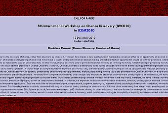 This workshop will discuss several problems in Chance Discovery. As shown, Chance Discovery is a research to study how to discover rare or novel events causing potentially significant situation. Although the event itself could not be significant. A chance might be computationally or manually discovered. Thus, advanced computational techniques such as abduction and induction (including data mining) could be applied to Chance Discovery. In addition, personalised and very traditional (sometimes, manual) data mining method could also be effective in Chance Discovery. We have discussed limitations of conventional data mining methods. And many new computational methods, and concepts and mechanisms of human discovery have been proposed. In the contexts, we have discussed how to discover and suggest events causing significant but hidden events. Our common understandings are that we deal with events in the real world, therefore, we need to have knowledge about movement in a society, behaviour of people, as well as computational methods. In addition, it is important to discuss effective chance evaluation, selection, and suggestion methods. It would be a gate for fantastic and innovative applications. Thus, we would like to discuss from logical, computational, cognitive, sociological, economical and psychological viewpoints. In addition, we would like to discuss ``curation'' of chance. Traditionally, curation is not only concerned with long-term care of books, paintings or other artefacts. It is also about maintaining their integrity and enabling and promoting their availability to appropriate audiences (http://www.jisc.ac.uk/e-sciencecurationreport.pdf). As shown above, for chance discovery, we have focused on strategies to discover rare or novel events and those to present hints of chance to users. By curation, we add a more active action to chance discovery, which curators usually struggle to explicitly or implicitly express extended or hidden meanings (values) to potential audiences.