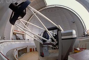 Telescopio BTA de 6 metros. En la imagen de ojo de pez puede apreciarse la montura de horquilla altazimutal