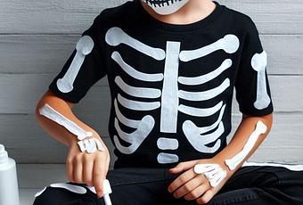 Un clásico atemporal que nunca falla. Solo necesitas una camiseta y unos pantalones negros, y recortar tiras de tela o fieltro blanco con forma de huesos. Puedes pegarlas o coserlas para crear el efecto esquelético. ¡Brilla en la oscuridad si usas pintura fosforescente!