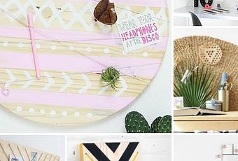 En Ohoh blog he encontrado esta otra propuesta para crear un panel todo lo que necesitemos para organizar el día a día, es tan amplio que también podemos colocar fotos y elementos decorativos. Necesitamos un tablero de madera de 120 cm x 60 cm x 6 mm , goma elástica negra, tornillos de gancho, un trozo de cuerda y papel de lija.