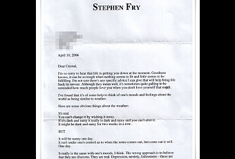 Aquí están algunas cosas obvias sobre el clima: Es real. No se puede modificar. Si no te gusta, no puedes echarlo a la basura y cambiarlo por otro más benigno. Si es oscuro y lluvioso, es en realidad oscuro y lluvioso, y no se puede alterar. Y puede ser que sea oscuro y lluvioso durante dos semanas seguidas. PERO... Un día será soleado. No está bajo nuestro control hacer que salga el sol, pero lo hará. Un día. Realmente es lo mismo con el propio estado de ánimo, me parece. El enfoque erróneo es creer que el dolor es una mera ilusión nuestra. Es real. La depresión, la ansiedad, la apatía; son reales, como el mal tiempo e, igualmente, no tenemos CONTROL en absoluto sobre ello. No es culpa nuestra. PERO... Pasarán: ellas (la depresión, la ansiedad, la apatía) pasarán. De la misma manera que uno tiene que aceptar las condiciones meteorológicas, uno tiene que aceptar cómo se siente acerca de la vida a veces. Proclamar: "Hoy es un día de mierda", es una actitud totalmente realista. Se trata de encontrar una especie de paraguas mental. 'Hey, está lloviendo en el interior: no es mi culpa y no hay nada que pueda hacer al respecto, más que sentarme a esperar. Pero el sol puede salir mañana y cuando lo haga, lo voy a aprovechar al máximo." No sé si nada de esto que te cuento te será de alguna utilidad: puede que no te lo parezca, y si es así, lo siento. Yo solo pensé en escribirte unas líneas, para desearte fortuna en tu búsqueda de un poco más de placer y de propósito para tu vida. Muy buenos deseos (Firmado) Stephen Fry