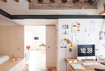 Comenzamos la semana con otro ejemplo espectacular de aprovechamiento de los espacios pequeños con este piso de 65m2 en pleno barrio de Gracia, Barcelona. Su dueña es diseñadora de interiores y diseñadora gráfica, y su buen hacer se nota en cada rincón de su casa. Una casa del siglo XIX en la que ha querido respetar al máximo los elementos constructivos originales, sabiendo integrarlos en la decoración marcada por un fuerte estilo personal que consigue una mezcla de estilos única. En la primera imagen vemos la entrada de la casa, que alberga la zona de trabajo y el habitáculo de madera que acoge el dormitorio, y que puede cerrarse completamente para aislarse de la luz y el ruido. Este espacio es uno de los ejemplos más claros del aprovechamiento de cada milímetro, con los cajones que se han añadido en el escalón de la cama. La zona de estudio tiene una doble altura que puede acoger otra cama en caso de necesitarlo. El comedor, totalmente diáfano e integrado con la zona de comedor y con la cocina, es un espacio precioso que resulta muy amplio pero también muy acogedor, gracias a detalles como la pared de ladrillo visto, o la bonita composición que se situa detrás del sofá: un cuadro muy decorativo, un espejo y unas baldas con revistas y pequeñas plantas. Este tipo de detalles decorativos son os que dan vida a los espacios, y en esta casa están en cada rincón. Y además, hay una mezcla maravillosa de tonos pastel, colores vivos y detalles metalizados. ¿Vamos a descubrirlos?