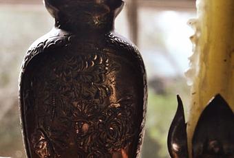 5 - Jarrón de cobre, con lo que se lleva ahora el cobre en decoración, porque no introducir una pieza antigua de este material, aunque en las fotos no se aprecie por el contra luz, el jarrón de cobre con preciosos relieves es una pieza exquisita para ese ambiente tenebroso que queremos conseguir. 6 - Palmatoria, no puede faltar en estos días, si ademas le añadimos una vela ya usada con gotitas petrificadas en los lados, da un efecto perfecto!