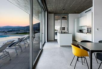 Las paredes de vidrio enmarcan perfectamente las vistas para los huéspedes que se relajan en la sala de estar de la villa, se reúnen alrededor de la mesa del comedor durante diez o preparan comidas en la cocina totalmente equipada. Los elegantes muebles crean un ambiente de elegancia contemporánea, y un diseño de concepto abierto le brinda el lujo de tener suficiente espacio para que todos pasen tiempo juntos.