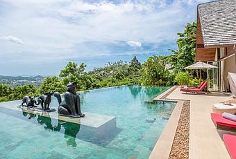 Construida en la ladera sobre Plai Laem, la villa se abre a una amplia terraza y piscina infinita que se extiende hacia el océano y las islas más pequeñas que la rodean. Después de nadar, estírese en una de las tumbonas o camastros, comience un juego en el jardín o retírese a la sombra del cine en casa o el gimnasio privado. La exposición al suroeste lo coloca en el lugar perfecto para ver la puesta de sol, y una terraza en la azotea es ideal para observar las estrellas.