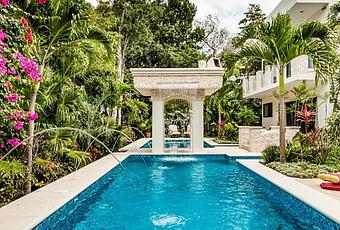 Rodeada de exuberantes jardines y árboles tropicales, la villa ofrece un entorno exquisito para organizar fiestas o relajarse con sus seres queridos. Dos piscinas climatizadas están unidas por una pasarela y un hermoso cenador, desde donde caen amplias cascadas.