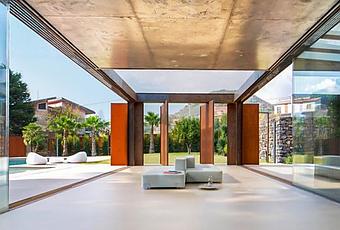 Dentro de la villa, las paredes de piedra se unen con paneles de vidrio, y una elegante chimenea comparte espacio con un techo pintado de estilo fresco en una imaginativa mezcla de lo antiguo y lo contemporáneo.