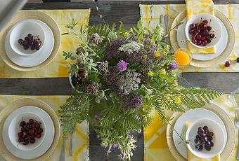 No puede haber mesa de verano que se precie que no tenga frutas y/o flores para decorarla. De hecho, son los elementos que hemos elegido para decorar estas 2 mesas tan diferentes usando en ellas los mismo manteles individuales Jugando con los elementos hemos conseguido una mesa tropical y una mesa más sencilla de estilo campestre.Para la primera, hemos usado frutas de muchos colores que hemos combinado con un "mantel" de helechos silvestres. Hemos decorado las servilletas con un cordel de pastelero y unas flores moradas, para que contrasten con el amarillo de las servilletas. ¡No hace falta más porque la propia fruta es muy decorativa, como decíamos antes! También hemos incluido un sol de madera que hicimos hace tiempo. Esta vez hace de salvamanteles, otro día es probable que lo veais de otra manera... jajaja!