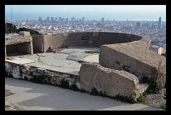 En 2012, un grupo de italianos residentes en Barcelona puso en marcha una acción penal contra sus compatriotas responsables de los bombardeos de marzo de 1938. La acción sigue adelante, y en Italia está removiendo muchas cosas enterradas y ha generado un debate público importante. En España por el contrario no solo la pretenden acallar los franquistas de siempre, sino que ciertos "progresistas" españoles reprochan "a los catalanes" una iniciativa que consideran insolidaria (???) con el resto de poblaciones bombardeadas, olvidando que se trata de una acción impulsada por un colectivo de extranjeros residentes que quiere establecer responsabilidades de connacionales, y que en todo caso, ni los barceloneses ni nadie tenemos que pedir permiso para reivindicar la memoria de hechos así ni desde luego esperar a que otros tengan a bien iniciar acciones similares. Tener que explicar estas cosas daría risa sino produjera indignación, dada la gravedad del asunto del que se habla. En la imagen que ilustra el post, emplazamiento de una pieza de artillería de la batería antiaérea situada en el Turó de la Rovira, de Barcelona. Obsérvese como el cañón se dirigía hacia el mar (a la derecha, la Torre Agbar), por donde venían desde Mallorca los aviones de bombardeo italianos, que una vez sobre la ciudad se guiaban siguiendo el trazado de las calles de la cuadrícula del Eixample en sentido mar-montaña (fotografía del autor).