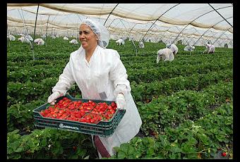 En la fotografía que ilustra el post, una jornalera trabaja bajo las carpas de plástico donde se producen todo el año cultivos hortofrutícolas y los trabajadores inhalan toda clase de pesticidas bajo un calor y humedad agobiantes.