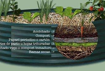 Más adelante veremos los distintos materiales que ocuparemos para levantar el bancal; lo primero es quitar la primera capa de pasto que tengamos y soltar bien la tierra, luego se ponen ramas secas, encima ponemos esitercol, o acolchados de bancales viejos o materia orgánica a medio descomponer, la siguiente capa es verde pasto recién cortado, hojas de podas o desecho verdes de la cocina todo picado fino, luego ponemos una buena cantidad de periódicos o cartón en su defecto, encima de esto una capa de no menos de 3 cm de compost y por ultimó el acolchado, puede ser paja, hojas secas, pasto seco o el de nuestra preferencia.