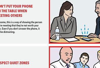 Business Insider ha creado la siguiente infografía que recopila 8 reglas de etiqueta para el uso de móviles que cualquier profesional debería conocer basadas en el libro de Barbara Pachter The Essential of Business Etiquette.