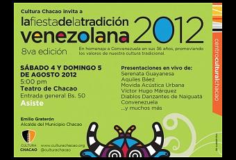 Diversos bailes, cantos y rituales de nuestra cultura popular, darán vida a la 8va. Edición de La Fiesta de la Tradición Venezolana, que presentará Cultura Chacao los días sábado 04 y domingo 05 de agosto a las 5:00 de la tarde, en el Teatro de Chacao, por medio de un colorido espectáculo musical de alta factura, que en esta ocasión rendirá homenaje a la agrupación Convenezuela en sus 36 años de fructífera trayectoria.
