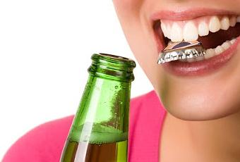 Romper el hábito de usar los dientes como una multiherramientas es una de las mejores maneras de protegerlos contra las grietas y las astillas que pueden dejar los dientes expuestos y desprotegidos en la lucha contra la caries dental. Esta imagen aquí es la única forma en que respaldaríamos abrir una botella con dientes.