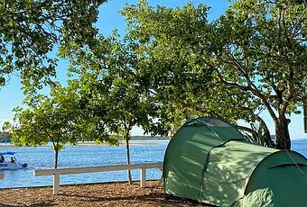 Una vez que haya montado su tienda de campaña o instalado su RV o caravana, únase a los otros visitantes para tomar una copa al atardecer bajo las palmeras y la higuera cíclope en el ámbito de picnic frente al río, y observe cómo los barcos se deslizan por las aguas cristalinas mientras el sol se desliza en el bóveda celeste.