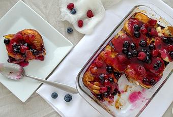Aunque el nombre puede sonar un poco raro, estas tostadas francesas no son más que un pudin en el que el pan no va deshecho sino que va en tostadas. Por lo demás, lleva prácticamente los mismos ingredientes y preparación. Éste que os traigo de nuestro blog Patty's Cake, lleva fruta fresca: arándanos y frambuesas y un caramelo por encima que es una delicia. Además, tiene la ventaja de que se hace por la tarde, se deja descansar en el frigo por la noche y se termina a la mañana siguiente. El paso a paso es muy sencillo. Ya veréis. ¡Os encantará!