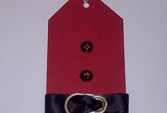 Cartulina roja, lazo negro, la anilla y botones negros... esto es todo lo que necesitas para hacer unas etiquetas tan resultonas como éstas.