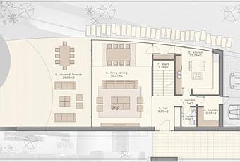 La superficie total de la planta de acceso a la vivienda es de 180m2 más 92m2 de terrazas, situadas en el comedor y en la entrada principal. En este nivel se situan las zonas de uso común. aseo de cortesía, hall, cuarto de lavado de 10m2, cocina de 36m2, salón de 52m2, comedor de 25m2 y un office de 6m2.