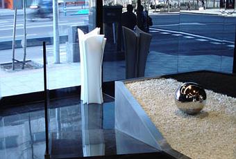Los mármoles que recubrían todo el portal han sido sustituidos por vidrio negro, dado su mal estado de conservación. Respetando la carpintería anterior se sustituyen también los vidrios exteriores por unos nuevos, se mejora el acceso y la rampa existente, se disponen foseados de luz en techos mediante leds, se incorpora una jardinera de grava blanca acompañada de las características bolas de A-cero, se ha instalado aire acondicionado y calefacción y dos maceteros Alma flanquearán la puerta de acceso.