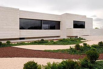 Los acabados de la fachada se realizan en mármol travertino blanco y vidrio negro
