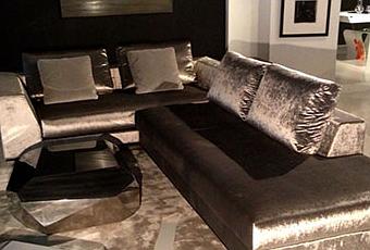 Este nuevo diseño de sofá viene terminado en terciopelo y su diseño sigue un juego en ángulos rectos y planos inclinados.