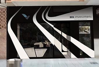 La fachada de estas oficinas está acabada en negro, sobre la que se proyectan una serie de líneas curvas en transversales en color blanco, sobre muros y vanos. Un amplio ventanal, el acceso y un segundo ventanal rectangular se utilizan como escaparate y fuente de luz natural.
