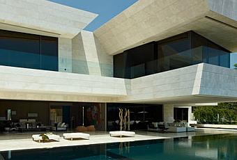 Destaca arquitectónicamente el gran volumen volado sobre el porche que acoge el dormitorio principal de la planta alta. Toda la vivienda está “vestida” en piedra de mármol travertino romano transventilado.